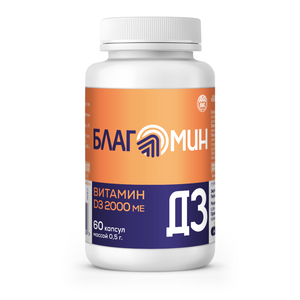 Витамин D способствует восполнению его дефицита в организме, лучшему усвоению кальция, укреплению костей, зубов, снижению риска развития остеопороза поддержке иммунитета и снижению риска развития простудных заболеваний. Способствует поддержанию сердечно-сосудистой, нервной систем и репродуктивной функции организма. В качестве биологически активной добавки к пище – дополнительного источника витамина D3 (в одной капсуле 2000 МЕ).Дефицит витамина Д3 возникает из-за особенностей его синтеза в организме – когда ультрафиолетовые лучи (УФ, UV) попадают на кожу. С едой витамин Д3 может поступать с мясом жирной рыбы или жиром печени рыб, яйцами. Принимая во внимание расположение Российской Федерации (в северных широтах) и ее климатические особенности с низким облучением солнцем, а также несбалансированность рациона или недоступность источников витамина Д3, по статистике более 70% жителей России всех возрастных групп испытывают недостаток витамина Д3.Витамин Д3 (холекальциферол) принимает участие во многих процессах организма – является ключевым фактором развития и сохранения здоровой костной ткани (регулирует фосфорно-кальциевый обмен), оказывает влияние на иммунную системы, β-клетки поджелудочной железы, сердечно-сосудистую систему, мозг. Благодаря витамину Д3 индуцируется секреция гормонов, модулируются иммунные реакции организма, под контроль попадает пролиферация и дифференцировка клеток.Витамин Д3 способствует поддержке:• здоровья костей и мышечной силы • иммунитета • нервной системы • репродуктивной системы и др.БЛАГОМИН D3 2000 МЕ – дополнительный источник витамина Д3. В капсуле БЛАГОМИН Витамин Д3 содержится 2 000 МЕ, что составляет 1 000% от рекомендуемого уровня суточного потребления (не превышает верхний допустимый уровень потребления). Благомин Д3 способствует восполнению дефицита витамина D в организме, лучшему усвоению кальция, укреплению костей и зубок, снижению риска развития простудных заболеваний, поддержанию сердечно-сосудистой, нервной систем и репродуктивной функции организма. Разрешен к применению с 14 лет. Выпускается в желатиновых капсулах без диоксида титана. Упаковки 60 капсул хватит на 2 курса применения.