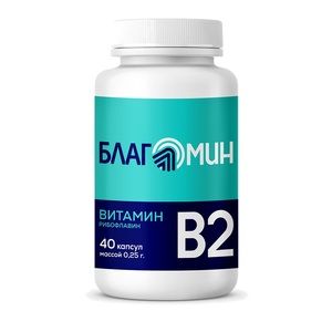 Витамин В2 участвует в углеводном обмене в качестве незаменимого кофермента во многих окислительно-восстановительных реакциях участвующих в углеводном и белковом метаболизме (производство энергии, клеточная функция, рост и развитие, метаболизм жиров, лекарств и стероидов, активность витаминов B3, В6). Важно обеспечить адекватный уровень поступления рибофлавина с пищей (молоко, сыр, печень, мясо, яйца). Риск дефицита рибофлавина повышается у людей, которые недостаточно употребляют с пищей молоко, продукты животного происхождения или у людей, страдающих заболеваниями печени, алкоголизмом. Недостаточность рибофлавина вызывает различные неспецифические поражения кожи и слизистых губ и рта, в том числе ангулярный стоматит, хейлоз, фарингит, глоссит, себорейный дерматит.Благомин В2 — дополнительный источник витамина В2. В 1 капсуле 2 мг рибофлавина, что составляет 125% от рекомендованного уровня суточного потребления и не превышает верхний допустимый уровень потребления. Для восполнения дефицита витамина В2 допускается приём 3 капсул в день (375% от рекомендованного уровня суточного потребления витамина В2, не превышает верхний допустимый уровень потребления).
