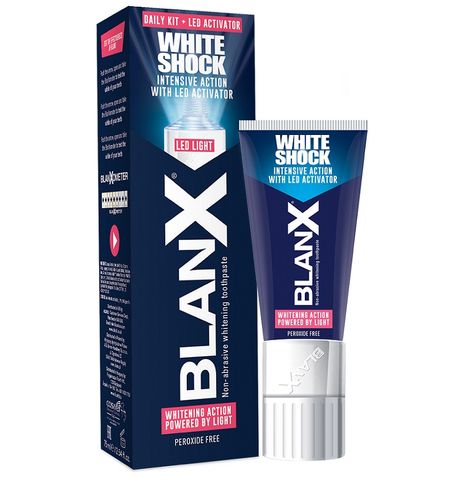 BLanx® White Shock Protect + Led активатор (Отбеливающий комплекс Вайт Шок со светодиодным активатором) — мгновенное отбелевание зубов, для ежедневного примененияВнешний вид и свойства: пастообразная, синий цвет, освежающий запахПаста Blanx White Shock создана на основе инновационной технологии Blue Formula и обладает революционной формулой, в основе которой лежит уникальный запатентованный активный ингредиент Actilux®, усиливающий свое действие благодаря свету!Прямо на тюбик с пастой накручивается специальная синяя лампа, идущая в комплекте. Просто почистите зубы зубной пастой BlanX White Shock и посветите на них лампой-активатором. Действующее вещество вступит в реакцию со светом, и ваши зубы станут заметно белее уже за одно применение.BlanX White Shock продолжает действовать не только во время применения лампы-активатора, но и на протяжении всего дня, в те моменты, когда вы улыбаетесь и на ваши зубы попадает свет.Каждый день, органические молекулы отвечающие за загрязнения, цвет, запах, и бактериальный налет разрушают поверхность ваших зубов. После чистки зубов они покрываются тончайшим защитным слоем, содержащим ActiluX, который не только удаляет пятна и загрязнения, но и препятствует образованию зубного налета.Кристаллы ActiluX®, взаимодействуя с дневным светом, производят положительные и отрицательные заряды, которые вступают в реакцию с кислородом и водой содержащимися в слюне и окружающей среде. Этот процесс формирует радикалы, безопасные для человека, но разрушающие органические молекулы, отвечающие за загрязнения. Ежедневно, при каждой улыбке, дневной свет и ActiluX® вступают в фотохимическую реакцию, чтобы сделать ваши зубы белее и вернуть их натуральный блеск! ActiluX® остается активным в течение всего дня, естественным образом отбеливая ваши зубы. Он также обладает антибактериальным эффектом, удаляя бактерии, которые являются причиной налета и кариеса.Уровень абразивности (RDA) — 39. НизкоабразивнаяРезультат: Белые зубыЭффект от применения не сохраняется на продолжительный срок, так как Actilux со временем смывается с зубов естественным образом. Зато BlanX White Shock абсолютно не вредит зубам, потому что не содержит ни жестких абразивов, ни отбеливающих веществ, вызывающих побочные эффекты в виде деминерализации эмали или гиперэстезии (повышенной чувствительности). Также, как и все зубные пасты Blanx, White Shock содержит экстракты арктических мхов, сохраняющие естественную белизну зубов и усиливающие эффект от Actilux.Специальные особенности: Не содержит Фтор, Пероксиды, Парабены, SLS, Диоксид титана, ПолиэтиленгликольПреимущества комплекта зубной пасты Blanx White Shock и светодиодного активатораРезультат отбеливания заметен после первого применения;Удаляет пятна не только на природной эмали, но на имплантах, протезах, винирах и пломбах;Не содержит пероксидов;Эффективно удаляет бактериальный налет;Повышение активности отбеливания компонента ActiluX на солнечном свету;Возможность проводить отбеливание не только на солнечном свету, но и с помощью светодиодного активатора.Используется для регулярной чистки.