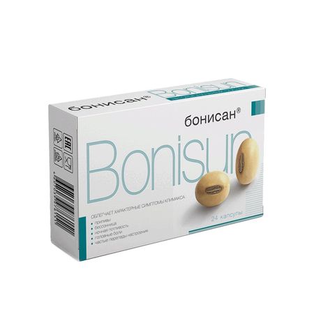 Капсулы «Бонисан» рекомендуются в качестве биологически активной добавки к пище – дополнительного источника изофлавонов. Капсулы облегчают характерные симптомы климакса (приливы, бессонница, ночная потливость, головные боли и частые перепады настроения). Основной компонент изофлавоны сои — фитоэстрагены, природные соединения растительного происхождения, схожие по структуре с женскими половыми гармонами. Они способствуют снижению симптомов климакса, замедляют процессы старения организма, препятствуют потере кальция, подавляют окисление «плохого холестерина». Соевый лецитин препятствует накоплению жиров.