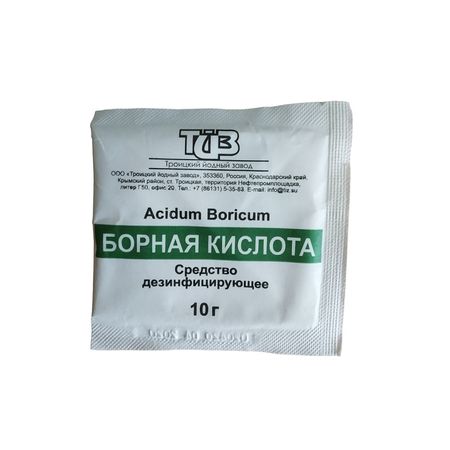 Средство дезинфицирующее «Борная кислота» (далее по тексту — средство) для дезинфекции поверхностей в помещениях, жесткой мебели, санитарно-технического оборудования, приборов (металла, резины, пластмассы, стекла), посуды, инвентаря (щетки, ерши, мочалки, губки и др.), уборочного инвентаря, тары, оборудования в пищевой промышленности, птицеводстве и животноводстве, на парфюмерно-косметических предприятиях (в том числе парикмахерских, косметических салонах и т.п.), на предприятиях общественного питания, коммунальных объектах и населением в быту. Пригодно для детских учреждений и ЛПУ.Средство обладает бактерицидной и фунгицидной (в отношении грибов родов Candida и Trichophyton) активностью.Средство представляет собой кристаллический порошок белого цвета без запаха.Срок годности средства — 5 лет со дня изготовления в невскрытой упаковке изготовителя. Срок годности рабочего раствора — 30 суток.По степени воздействия на организм средство (борная кислота) относится к малоопасным веществам (4-й класс опасности согласно ГОСТ 12.1.007-76).В результате вдыхания пыли борной кислоты в концентрации, превышающей 10 мг/м3, может возникать слабое раздражение носа и глотки.При обычном использовании в промышленности, борная кислота раздражающего действия на глаза не оказывает.Борная кислота не вызывает раздражения неповрежденной кожи.Продукты, содержащие борную кислоту, не предназначены для приема внутрь. Борная кислота обладает низкой острой токсичностью. Развитие каких-либо проявлений при случайном проглатывании малого количества продукта (например, чайной ложки) маловероятно; прием внутрь больших количеств может вызвать симптоматику со стороны желудочно-кишечного тракта.ПДК борной кислоты в воздухе рабочей зоны — 10 мг/м3.Рабочий раствор средства по параметрам острой токсичности при попадании в желудок и нанесении на кожу, согласно ГОСТ 12.1.007, относится к 3 классу мало опасных веществ. Местно-раздражающие, кожно-резорбтивные и сенсибилизирующие свойства рабочего раствора не выражены. Рабочий раствор обладает умеренным раздражающим действием на оболочки глаза. При ингаляционном воздействии паров рабочий раствор в насыщающих концентрациях оно относится ко 2 классу опасности по степени летучести.