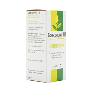 Показания к применению— в качестве отхаркивающего средства в комплексной терапии воспалительных заболеваний дыхательных путей (в т.ч. бронхита, трахеита), сопровождающихся кашлем с трудноотделяемой мокротой.Противопоказания— хроническая сердечная недостаточность (в стадии декомпенсации);— тяжелые нарушения функции печени;— тяжелые нарушения функции почек;— врожденная непереносимость фруктозы, глюкозо-фруктозная мальабсорбция, недостаточность ферментов сахаразы и изомальтазы;— детский возраст до 1 года;— повышенная чувствительность к компонентам препарата.;В связи с содержанием в препарате этилового спирта эликсир Бронхикум; ТП не следует применять у больных алкоголизмом.;С осторожностью и только после консультации с врачом следует принимать эликсир пациентам с заболеваниями печени, заболеваниями и травмами головного мозга, эпилепсией.СоставЖидкий экстракт травы тимьяна (1:2-2.5)* 5 г, жидкий экстракт корней первоцвета (1:2-2.5)** 2.5 г. * Экстрагент: раствор аммиака 10%, глицерол 85%, этанол 90 об.%, вода (в соотношении 1:20:70:109). ** Экстрагент: этанол 70%. Вспомогательные вещества: натрия бензоат, сахарный сироп специальный (смесь сахарозы, декстрозы, фруктозы), вода очищенная.
