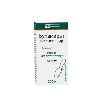 Показания После приема внутрь бутамират быстро и полностью всасывается, измеряемые концентрации обнаруживаются в крови через 5-10 мин после приема. Сmax в плазме крови достигается в течение 1 ч. Средние концентрации в плазме 2-фенилмасляной кислоты достигаются в течение 1.5 ч. Бутамират имеет большой Vd в диапазоне 81-112 л (с поправкой на массу тела в кг), а также высокую степень связывания с белками плазмы. 2-фенилмасляная кислота имеет высокую степень связывания с белками плазмы — в среднем 89.3 — 91.6%. Также обнаруживается способность диэтиламиноэтоксиэтанола к связыванию с белками плазмы, средние показатели варьируются в пределах 28.8% — 45.7%. Неизвестно, проникает ли бутамират через плаценту или выделяется с материнским молоком. Гидролиз бутамирата, в результате которого образуются 2-фенилмасляная кислота и диэтиламиноэтоксиэтанол, обладающие противокашлевым действием, происходит очень быстро. 2-фенилмасляная кислота подвергается дальнейшему частичному метаболизму путем гидроксилирования в параположении. Выведение трех метаболитов происходит в основном через почки; после конъюгации в печени, метаболиты с кислой реакцией в значительной степени связываются с глюкуроновой кислотой. Конъюгаты 2-фенилмасляной кислоты определяются в моче в значительно более высоких концентрациях, чем в плазме крови. Бутамират обнаруживается в моче в течение 48 ч. Бутамират экскретируется с мочой в большем количестве в виде диэтиламиноэтоксиэтанола, чем бутамират в неизменном виде или в виде неконъюгированной 2-фенилмасляной кислоты. Измеряемый Т1/2 2-фенилмасляной кислоты, бутамирата и диэтиламиноэтоксиэтанола составляет 23.26-24.42 ч, 1.48-1.93 ч и 2.27-2.90 ч соответственно. Фармакологическое действие Противокашлевое средство центрального действия. Бутамират не относится к алкалоидам опия. Не формирует зависимости или привыкания. Подавляет кашель, оказывая прямое влияние на кашлевой центр. Обладает умеренным бронходилатирующим действием. Способствует облегчению дыхания, улучшает показатели спирометрии (снижает сопротивление дыхательных путей) и оксигенацию крови. Лекарственное взаимодействие В связи с тем, что бутамират подавляет кашлевой рефлекс, следует избегать одновременного применения отхаркивающих средств во избежание скопления мокроты в дыхательных путях. В период лечения бутамиратом не рекомендуется применение лекарственных средств, оказывающих угнетающее влияние на ЦНС (в т.ч. снотворные, антипсихотические, транквилизаторы).