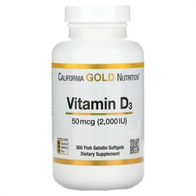 Витамин D3 от California Gold Nutrition50 мкг (2000 МЕ) Капсулы из рыбьего желатина Поддерживает здоровье костей и зубов* Способствует нормальной работе иммунной системы* Продукт не содержит глютена, ГМО и сои Производится на предприятии, которое имеет регистрацию текущей надлежащей производственной практики (cGMP) и проходит независимые проверкиВитамин D3 — предпочтительная для организма форма витамина D. Иногда его называют «солнечным витамином», поскольку он вырабатывается в коже под воздействием солнечных лучей. Витамин D — незаменимый витамин для многих метаболических процессов. Витамин D3 помогает регулировать усвоение кальция и фосфора, а также поддерживает здоровую функцию иммунной системы*. Витамин D3 California Gold Nutrition содержит 50 мкг (2000 МЕ) витамина D3 в виде холекальциферола из ланолина в капсулах из рыбьего желатина.