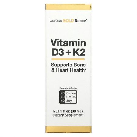 Витамины D3 и K2 от California Gold NutritionЖирорастворимые витамины для повышенной биодоступностиПоддержка здоровья костей и сердца*Не содержит глютена, ГМО и сои Производится на предприятии, которое имеет регистрацию текущей надлежащей производственной практики (cGMP) и проходит независимые проверкиГарантия 100% Gold Guarantee