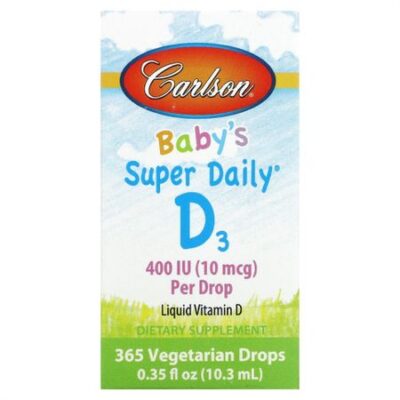Пищевая ценность Размер порции: 1 капля (0,028 мл / 0,001 жидк. унции) Порций в упаковке: прибл. 365 Количество в 1 порции % от суточной нормы для детей до 12 месяцев % от суточной нормы для детей от 1 до 3 лет Витамин D (в виде холекальциферола) 10 мкг (400 МЕ) 100% 67% 400 МЕ (10 мкг) в одной капле Витамин D в жидкой форме Пищевая добавка 365 капель Без глютена Без сои Без искусственных консервантов Предприятие подконтрольно Управлению по санитарному надзору за качеством пищевых продуктов и медикаментов США (FDA)Преимущества витамина D3 для детей Super Daily: здоровье костей здоровые зубы поддержка иммунной системы здоровье сердечно-сосудистой системы здоровье мышц рост и развитиеСолнечный витаминВитамин D3 играет важную роль для здоровья в целом.Однако для его выработки необходим солнечный свет, который не все получают в достаточном количестве. Витамин D3 для детей Super Daily от Carlson предлагает безопасный и удобный способ получения витамина D3. Одна капля витамина D3 для детей Super Daily от Carlson содержит 400 МЕ (10 мкг) концентрированного жидкого витамина D3 — рекомендуемую дозу Американской академии педиатрии.