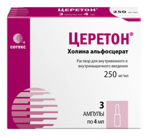 Показания к применению Нарушения мозгового кровообращения по ишемическому типу (острый и восстановительный периоды) и геморрагическому типу (восстановительный период). Психоорганический синдром на фоне инволюционных и дегенеративных процессов головного мозга. Последствия цереброваскулярной недостаточности или первичные и вторичные когнитивные нарушения у пожилых, характеризующиеся нарушением памяти, спутанностью сознания, дезориентацией, снижением мотивации и инициативности, снижением концентрации внимания. Нарушение поведения и аффективной сферы в старческом возрасте; эмоциональная лабильность, повышенная раздражительность, снижение интереса; старческая псевдомеланхолия. Мультиинфаркгная деменция.Применение при беременности и кормлении грудьюПрименение препарата Церетон® во время беременности и грудного вскармливания противопоказано.Противопоказания Гиперчувствительность к действующему веществу и/или любому вспомогательному веществу препарата. Беременность. Период грудного вскармливания. Детский возраст до 18 лет при применении по остальным показаниям (в связи с отсутствием данных по эффективности и безопасности).Побочное действиеСо стороны желудочно-кишечного тракта: тошнота (которая главным образом является следствием вторичной допаминергической активации), боль в животе.Со стороны нервной системы: кратковременная спутанность сознания (в этом случае необходимо уменьшить дозу препарата).Препарат хорошо переносится даже при длительном применении.Состав1 ампула (4 мл раствора для внутривенного и внутримышечного введения) содержит:Действующее вещество: глицерилфосфорилхолина гидрат в пересчете на безводный глицерилфосфорилхолин (холина альфосцерат) — 1000 мг,Вспомогательные вещества: вода для инъекций — до 4 мл.Взаимодействие с другими препаратамиКлинически значимого лекарственного взаимодействия с другими препаратами не выявлено.
