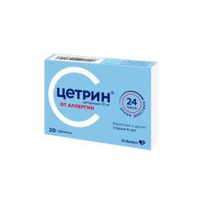 Показания сезонный и круглогодичный аллергический ринит; аллергический конъюнктивит; поллиноз (сенная лихорадка); крапивница (в т.ч. хроническая идиопатическая крапивница); зудящие аллергические дерматозы (атопический дерматит, нейродермит); ангионевротический отек (отек Квинке). Фармакологическое действие Конкурентный антагонист гистамина, метаболит гидроксизина, блокирует Н1-гистаминовые рецепторы. Предупреждает развитие и облегчает течение аллергических реакций, обладает противозудным и противоэкссудативным действием. Влияет на раннюю стадию аллергических реакций, ограничивает высвобождение медиаторов воспаления на «поздней» стадии аллергической реакции, уменьшает миграцию эозинофилов, нейтрофилов и базофилов. Уменьшает проницаемость капилляров, предупреждает развитие отека тканей, снимает спазм гладкой мускулатуры. Устраняет кожную реакцию на введение гистамина, специфических аллергенов, а также на охлаждение (при холодовой крапивнице). Снижает гистаминоиндуцированную бронхоконстрикцию при бронхиальной астме легкого течения. Практически не оказывает антихолинергического и антисеротонинового действия. В терапевтических дозах практически не оказывает седативного эффекта. Начало эффекта после разового приема 10 мг цетиризина — 20 мин, длительность эффекта — 24 ч. На фоне курсового лечения толерантность к антигистаминному действию цетиризина не развивается. После прекращения лечения действие сохраняется до 3 сут. Лекарственное взаимодействие Фармакокинетического взаимодействия с псевдоэфедрином, циметидином, кетоконазолом, эритромицином, азитромицином, диазепамом и глипизидом не обнаружено. Совместное назначение с теофиллином (400 мг/сут) приводит к снижению общего клиренса цетиризина (кинетика теофиллина не изменяется). Миелотоксические лекарственные средства усиливают проявления гематотоксичности препарата.