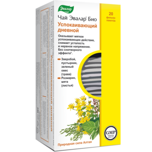Оказывает мягкое успокаивающее действие, снимает усталость и нервное напряжение.Как работают ингредиентыЗверобой с давних пор является народным средством, которое завоевало признание и в научной медицине. Зверобой оказывает мягкое успокаивающее действие на нервную систему, обладает антидепрессантным и анксиолитическим действием.Пустырник сердечный издавна известен своим седативным свойством, направлен на нормализацию функционального состояния центральной нервной системы, оказывает гипотензивное, кардиотоническое действие.Зеленый овес действует как общеукрепляющее средство. Трава обладает анальгетическим, мягким седативным действием, положительно влияет на сердечную деятельность. Препараты овса повышают физическую работоспособность и выносливость, уменьшают стрессовые реакции. Розмарин лекарственный обладает общим тонизирующим, противовоспалительным, вяжущим действиями. Эфирное масло розмарина способствует уменьшению психоэмоционального напряжения. Мята перечная обладает успокаивающим, противосудорожным, противовоспалительным, обезболивающим действием.Достоинства чаев «Эвалар БИО»: 100% натуральный состав.Большинство трав, входящих в состав, собираются на Алтае или выращиваются на собственных плантациях Эвалар в экологически чистых предгорьях Алтая без использования химикатов и пестицидов, Высокая микробиологическая чистота чаев обеспечивается мягким способом обработки – «мгновенный пар» — на современной французской установке, Для наилучшего сохранения целебных свойств, тонкого вкуса и аромата травяного чая каждый фильтр-пакет индивидуально упакован в многослойный защитный конверт.Почувствуйте природную силу Алтая в травяных чаях Эвалар Био.Чай Эвалар Био – здоровье в каждой чашке.Гарантия чистоты и качества по стандарту GMP.