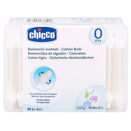 Ватные палочки Chicco Baby Moments изготовлены из 100% натурального хлопка, обладают высокой впитывающей способностью и прекрасно подходят для ежедневных гигиенических. Благодаря своей гибкости и мягкости их можно использовать с первых дней жизни ребёнка. Утолщение намотки наконечника (в виде ограничителя) не позволит глубоко проникнуть в ушной ход ребенка, тем самым исключая травмы ушка новорожденного.