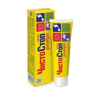 Косметический крем для ухода за очень утолщенной, огрубевшей и шелушащейся кожей ног. Активные компоненты крема способствуют устранению избыточного ороговения, повышению эластичности и увлажнения кожи, а также – повышению пластичности ногтевых пластинок:- при грибковом поражении — при склонности к гиперкератозу и трещинам стопТрещины на пятках, шелушение кожи стоп, зуд, жжение, утолщение ногтевой пластины, утолщение и огрубение кожи (гиперкератоз) – это характерные проявления грибка стопы и онихомикоза (грибка ногтей). Для борьбы с грибком и его профилактики рекомендуется применение противогрибкового крема для ног с высоким содержанием мочевины и противогрибковым компонентом.Активные компоненты ЧИСТОСТОП УЛЬТРА крем уход за очень огрубевшей и шелушащейся кожей ног с грибковым поражением способствуют устранению избыточного ороговения, повышению эластичности и увлажнения кожи, а также повышению пластичности ногтевых пластинок при грибковом поражении и склонности к гиперкератозу и трещинам стоп.В состав ЧИСТОСТОП УЛЬТРА крем входят:2% УНДЕЦИЛЕНАМИДОПРОПИЛТРИМОНИУМ МЕТОСУЛЬФАТ (ТЕТРАНИЛ У)• останавливает процессы, которые обеспечивают жизненные функции, клеток грибка• снижает риск после контакта с поверхностями и предметами, потенциально зараженными грибком (пляжи, бани, бассейны, спортзалы, чужая обувь, спортивный инвентарь и др.)30% МОЧЕВИНА• способствует глубокому увлажнению и смягчению кожи• проявляет себя как кератолитик – способствует слущиванию и отшелушиванию омертвевших клеток кожи, делая ее более гладкой и мягкой• «разрыхляет» роговой слой кожи и улучшает проникновение через кожу и ногти других ингредиентов крема для усиления действия крема• 30% мочевина постепенно и безболезненно размягчает ногти, облегчая подрезание и обработку при утолщении ногтя0,2% ТРИКЛОЗАН• останавливает процессы, которые обеспечивают жизненные функции, клеток бактерий и клеток грибка• остается на коже длительное время и действует даже после того, как ноги ополоснулиЭФИРНОЕ МАСЛО ЧАЙНОГО ДЕРЕВААктивные компоненты эфирного масла чайного дерева способствуют:• снижению воспаления и зуда• ускорению заживления• снижению риска инфицирования ЧИСТОСТОП УЛЬТРА КРЕМ – крем для ног с 30% мочевиной и маслом чайного дерева для ухода за огрубевшей кожей с грибковым поражением.ЧИСТОСТОП — ЛИНИЯ КОСМЕТИЧЕСКИХ СРЕДСТВ ДЛЯ УХОДА ЗА КОЖЕЙ С ГРИБКОВЫМ ПОРАЖЕНИЕМ И ИЗБЫТОЧНЫМ ПОТООТДЕЛЕНИЕМ. ЧИСТОСТОП УЛЬТРА КРЕМ — уход за очень утолщенной, огрубевшей и шелушащейся кожей ног с грибковым поражением.ЧИСТОСТОП УЛЬТРА ГЕЛЬ — освежающий уход за утолщенной кожей ног и профилактика инфекций стоп и ногтей.ЧИСТОСТОП крем — для профилактики и ухода за кожей с гиперкератозом и трещинами кожи стоп и снижения риска развития грибковых заболеваний.ЧИСТОСТОП УЛЬТРА гель-антиперспирант для рук и ног — уход за кожей ног и рук с повышенным потоотделением.ЧИСТОСТОП ДЕО — уход за кожей ног и рук с повышенным потоотделением и дезодорирующим и антибактериальным эффектами.