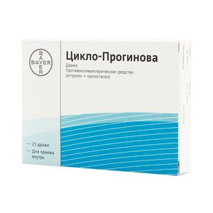 Показания к применениюЗаместительная гормональная терапия (ЗГТ) при климактерических расстройствах, инволюционных изменениях кожи и мочеполового тракта, депрессивных состояниях в климактерическом периоде, а также симптомах дефицита эстрогенов вследствие естественной менопаузы или гипогонадизма, стерилизации или первичной дисфункции яичников у женщин с неудаленной маткой.Профилактика постменопаузального остеопороза.Нормализация нерегулярных менструальных циклов.Лечение первичной или вторичной аменореи.Применение при беременности и кормлении грудьюЗГТ не назначается во время беременности или кормления грудью.Крупномасштабные эпидемиологические исследования стероидных гормонов, используемых для контрацепции или ЗГТ, не выявили увеличения риска развития врожденных дефектов у детей, родившихся у женщин, которые принимали такие гормоны до беременности, а также тератогенного воздействия гормонов при их случайном приеме в ранние сроки беременности.Небольшое количество половых гормонов может выделяться с материнским молоком.ПротивопоказанияНе рекомендуется начинать заместительную гормональную терапию (ЗГТ), при наличии любого из перечисленных ниже состояний. Если какое-либо из данных остояний возникнет во время ЗГТ, то следует немедленно прекратить использование препарата.Беременность и лактация.Влагалищное кровотечение неясного происхождения.Подтвержденный или предполагаемый диагноз рака молочной железы.Подтвержденный или предполагаемый диагноз гормонозависимого предракового заболевания или гормонозависимой злокачественные опухоли.Опухоли печени в настоящее время или в анамнезе (доброкачественные или злокачественные).Тяжелые заболевания печени.Острый артериальный тромбоз или тромбоэмболия (такие как инфаркт миокарда, инсульт).Тромбоз глубоких вен в стадии обострения, тромбоэмболии в настоящее время или в анамнезе.Выраженная гипертриглицеридемия.Повышенная чувствительность к компонентам препарата Цикло-Прогинова.СоставДействующее вещество: 1 белое драже содержит 2,0 мг эстрадиола валерата, 1 светло-коричневое драже содержит 2,0 мг эстрадиола валерата и 0,5 мг норгестрела.Концентрация действующего вещества (мг): 2 мг и 2,5 мг.
