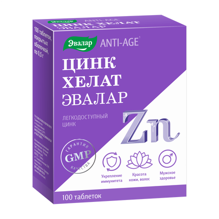 Цинк хелат Эвалар способствует:- Повышению сопротивляемости организма к инфекциям (укреплению иммунитета);- Предотвращению выпадения волос;- Синтезу собственного коллагена;- Антиоксидантной защите (Anti-Age эффекту);- Усилению выработки инсулина;- Синтезу тестостерона;- Позволяет регулировать деятельность сальных желез, справляться с жирным блеском кожи и покраснениями;- Участвует в процессе сперматогенеза.Преимущества Цинк хелат «Эвалар»:- Удобный прием – всего 1 таблетка в день;- Не вызывает побочных эффектов со стороны ЖКТ;- Экономичная упаковка;- Выгодная цена1;- Сырье высокого качества;- Разрешен беременным и кормящим женщинам; — Произведен по международному стандарту качества GMP2.
