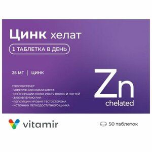 Каждый день мы неизбежно сталкиваемся с инфекциями. Как можно эффективно помогать иммунитету?Цинк имеет решающее значение для поддержания нормальной иммунной активности на протяжении всей жизни. Являясь катализатором многих клеточных процессов, цинк обладает антиоксидантными и противовоспалительными свойствами.«Цинк хелат» — биологически активная добавка к пище, дополнительный источник цинка. Способствует повышению иммунитета, катализирует многие клеточные процессы, является мощным антиоксидантом, входит в состав инсулина, регулирует уровень тестостерона, участвует в формировании костной и хрящевой тканей, способствует их восстановлению.Суточная доза (1 таблетка) содержитЦинк 20,0 — 25,0 мгИнформация о биологически активных веществах и их свойствах:Цинк — незаменимый элемент питания, который является важным компонентом почти ста различных ферментов. В их составе цинк обеспечивает скорость процессов дыхания и газообмена, разрушает свободные радикалы, оказывая антиоксидантное действие, участвует в передаче генетической информации в составе ДНК- и РНК-полимераз. Гормон инсулин, который контролирует уровень сахара в крови, накапливается в организме в виде комплекса с цинком.Положительно влияя на репродуктивную функцию, цинк улучшает работу предстательной железы, регулирует уровень тестостерона в крови, необходим для развития половых желез.Цинк способствует образованию Т-лимфоцитов — клеток, ответственных за иммунный ответ. Поэтому он необходим для нормального функционирования иммунной системы.Цинк является важным микроэлементом, способствующим синтезу коллагена — основы соединительной ткани, а именно костной и хрящевой. Дополнительный прием цинка способствует нормализации роста и восстановления этих тканей.Цинк играет важную роль в поддержании здоровья организма за счет своих антиоксидантных свойств и противовоспалительного действия.Одна из наиболее интересных функций цинка — участие в восприятии вкуса и запаха рецепторами языка и полости носа.Хелат — это наиболее энергетически выгодная для организма форма взаимодействия металла с элементом. В таких комплексах его активность возрастает в сотни раз по сравнению с активностью металла в ионном состоянии. К тому же хелатные соединения легко усваиваются, и организм при необходимости может без вреда переносить большие дозы микроэлементов, которые при употреблении в виде неорганических солей могут являться токсичными.
