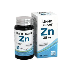 «Цинк хелат Zn 25 мг» — твёрдые желатиновые капсулы массой 326 мг в потребительской упаковке.Средняя суточная норма цинка по разным источникам составляет от 8 до 15 мг.Информация о действующих компонентах:«По современным оценкам, риск дефицита цинка отмечается более чем у полутора миллиардов человек в мире. В России дефицит этого элемента встречается у 20-40% населения, в отдельных регионах достигая 60%. Учитывая важнейшую роль цинка в регуляции иммунитета, справедливо предположить, что его недостаток может являться фактором риска инфекционных заболеваний» (заведующий лабораторией молекулярной диетологии Сеченовского университета профессор Анатолий Скальный https://www.sechenov.ru/pressroom/news/uchenye-otsenili-perspektivy-ispolzovaniya-tsinka-dlya-profilaktiki-koronavirusa-/)Пищевые источники цинка:Наиболее богаты цинком устрицы, говядина, баранина, кунжутные и тыквенные семена, кедровые орехи.Польза для здоровьяЦинк играет важную роль в поддержке здоровья и нормального функционирования всего организма. Среди основных полезных свойств: участие в метаболизме и клеточном энергообмене (входит в состав ферментов, улучшающих усвоение питательных веществ и ускоряющих выведение продуктов распада из организма), стимулирование выработки гормонов (инсулина, кортикостероидов, тестостерона), а также нуклеиновых кислот, белков и других необходимых для здоровья веществ, укрепление иммунитета (обладает мощными антибактериальными и противовирусными свойствами, снижает продолжительность течения простудных заболеваний), поддержание здоровья сердца (регулирует поступление ионов кальция в клетки сердца и предотвращает оксидантный стресс, стимулируя выработку антиоксиданта глутатиона), улучшение пищеварения (нормализует кишечную проницаемость, улучшает всасываемость питательных веществ, предупреждает появление диареи), стимулирование репродуктивной функции (улучшает качество половых клеток, поддерживает здоровье предстательной железы у мужчин, влияет на развитие половых органов у девушек в подростковом возрасте), нормализация уровня сахара в крови (регулирует секрецию инсулина, повышает чувствительность организма к этому гормону, снижает риск развития диабета), регенеративные функции (способствует заживлению ран и травм, росту и восстановлению мышц, необходим детям в период роста и женщинам во время беременности), улучшение функций мозга (нужен для правильного восприятия вкуса и запаха, благотворно влияет на память, координацию, мышление), обеспечение поддержки зрения (сохраняет здоровье сетчатки глаза, предотвращает развитие катаракты, ночной слепоты, возрастных дегенеративных изменений глаз), улучшение состояния кожи (борется с акне, экземой и псориазом) и волос (уплотняет структуру, предотвращает их выпадение).Иммунитет.Цинк способствует повышению активности иммунных клеток и усилению производства антител в ответ на действие инфекций. Цинк и связывающие его вещества противодействуют распространению вирусов в организме. Существует 118 цинксодержащих белков, поддерживающих противовирусный иммунитет.Дефицит цинка считается одним из факторов риска для развития пневмонии. Отдельные исследования показывают эффективность цинкосодержащих препаратов в сокращении времени проявления симптомов и снижении распространенности пневмонии.ЗрениеЦинк регулирует реакции 