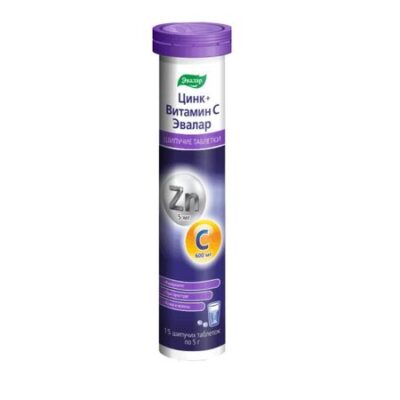 ЭВАЛАР ЦИНК+ВИТАМИН C — Биологически активная добавка (БАД) к пищеЦинк + Витамин С от «Эвалар» способствует:• укреплению иммунитета• снижению риска развития простудных и вирусных заболеваний• антиоксидантной защите• красоте кожи, волос.Именно длительный и регулярный прием Цинк + Витамин С обеспечит бесперебойную работу защитных сил вашего организма на протяжении всего периода сезонных простудных заболеваний.Преимущества Цинк с витамином С Эвалар:- Легкодоступная шипучая форма8- Мощный состав для укрепления иммунитета9- Удобный прием — всего 1 таблетка в день- Сырье высокого качестваСодержание в 1 таблетке:Витамин С 600 мгЦинк 5 мгБактерии и вирусы существуют повсюду и даже могут находиться в нашем организме. Но только в те моменты, когда, по разным причинам, иммунитет ослабевает, они активизируются, размножаются, — и мы заболеваем. Между тем, простуду и грипп можно предупредить. Всем известны меры профилактики: закаливающие процедуры, запрет на посещение мест скопления людей, употребление чеснока и лука. Однако эти меры не всегда выполнимы.Более легкий и эффективный способ стать «неуязвимым» — обеспечить свою иммунную систему цинком и витамином С — микронутриентами, необходимыми ей для активной работы на весь период, угрожающий опасностью заболеть. Доказана тесная связь между достаточным содержанием цинка и витамина С в организме и активностью иммунной системы. Именно их в оптимальных дозировках содержат шипучие таблетки Цинк + Витамин С от «Эвалар»Цинк — одно из немногих веществ, которое влияет одновременно на все звенья иммунитета человека. Он повышает выработку интерферонов — белков, которые первыми встают на защиту организма против инфицирования вирусами, бактериями и другими микроорганизмами. Цинк препятствует распространению вируса в клетке, защищает от разрушения лимфоциты. Также он усиливает функции тимуса (вилочковой железы), который иногда даже называют «сердцем иммунной системы» за счет способности производить новые Т-клетки. Именно они, в свою очередь, распознают вирусы и нейтрализуют их.Витамин С — признанный иммуностимулятор. Он усиливает выработку белков интерферонов, которые вступают в борьбу с вирусами одними из первых. Обладает противовоспалительными свойствами, способствует нейтрализации свободных радикалов и защите клеток легких от их агрессивного воздействия.