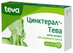 Показания к применениюПрофилактика и лечение дефицита цинка, вызванного неполноценным и несбалансированным питанием, нарушением всасывания и другими состояниями, которые нарушают усвоение цинка и увеличивают его потерю организмом.Acrodermatitis enteropathica (энтеропатический акродерматит), acne pustulosa и acne phlegmonosa (гнойные и флегмонозные угри). При длительном лечении глюкокортикостероидами, особенно в момент отмены препаратов.В качестве вспомогательного лечения труднозаживающих ран.Применение при беременности и кормлении грудьюБеременностьЦинк проникает через плацентарный барьер. Исследования влияния солей цинка в обычных дозировках на течение беременности и развитие плода не проводились. Соответствующие исследования на животных также не проводились.Лекарственный препарат можно использовать во время беременности только в тех случаях, когда, по мнению врача, польза для матери превышает потенциальный риск для плода.Кормление грудьюЦинк проникает в грудное молоко. Исследования влияния солей цинка в обычных дозировках у кормящих женщин не проводились. Не рекомендуется применять лекарственный препарат в период кормления грудью.Влияние на фертильностьНет данных, в какой степени препарат Цинктерал®-Тева способен влиять на фертильность.ПротивопоказанияПовышенная чувствительность к компонентам препарата, детский возраст до 4-х лет, непереносимость лактозы, дефицит лактазы, глюкозо-галактозная мальабсорбция период грудного вскармливания.Побочное действиеАллергические реакции. Дефицит меди. Могут отмечаться (особенно при приеме больших доз): желудочно-кишечные расстройства (тошнота, диарея, изжога) гематологические расстройства, обусловленные вызванным цинком дефицитом меди, в том числе лейкопения, сопровождающаяся повышенной температурой, ознобом, болью в горле нейтропения, сопровождающаяся образованием язв в ротовой полости и глотки сидеробластная анемия, сопровождающаяся чувством усталости, слабостью.Могут появиться головная боль и металлический привкус во рту.В случае возникновения вышеуказанных симптомов следует прекратить применение препарата и немедленно обратиться к врачу.СоставВ 1 таблетке содержится: действующее вещество цинка сульфата моногидрат 124,0 мг, что соответствует цинку 45,0 мг вспомогательные вещества: лактозы моногидрат 78,5 мг, крахмал картофельный 38,75 мг, повидон-К25 20,00 мг, тальк 12,38 мг, магния стеарат 1,37 мг оболочка: гипромеллоза 6,897 мг, макрогол (полиэтиленгликоль) 0,448 мг, титана диоксид (Е171) 1,79 мг, алюминиевый лак на основе красителя азорубин (Е122) 0,865 мг.