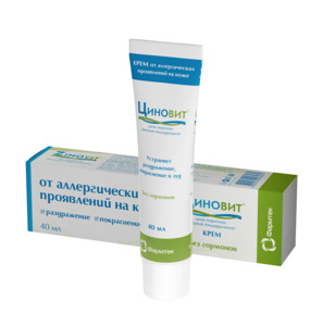 Циновит Крем — крем от аллергических проявлений на коже. Крем следует применять в качестве негормонального противовоспалительного средства при хронических заболеваниях кожи.Активные компоненты: Цинк пиритион Дикалий глицирризинат Натуральные масла (оливковое, авокадо, ши) Незаменимые жирные кислотыСодержит два противовоспалительных компонента: Цинк пиритион Дикалий глицирризинатБез гормонов избавит от симптомов воспаления на коже!Обладает антисептическим эффектом.Содержит только натуральные масла в основе крема.В составе Циновит крема содержится комплекс активных компонентов, который справляется с раздражением, покраснением, воспалением и зудом.Влияние компонентов ЦИНОВИТ крема на кожу:Цинк пиритион — снижает внутриклеточный уровень АТФ, способствует деполяризации клеточных мембран, вызывая гибель грибов и бактерий.Влияние на кожу: Противовоспалительный эффект Противогрибковый эффект Антибактериальное действие (Streptococcus spp., Staphylococcus spp., Escherichia coli, Proteus spp.) Себостатическое действие (нормализует работу сальных желез) Кераторегулирующее действие (подавляет патологический рост клеток поверхностных слоев кожи, устраняет избыточное шелушение).Дикалий глицирризинат — активный компонент корня солодки.Влияние на кожу: Противовоспалительное действие Делает кожу менее восприимчивой к веществам, вызывающим аллергию, раздражение и зуд.Натуральные масла (оливковое, жожоба, ши) — незаменимы жирные кислоты (линолевая, линоленовая) полностью усваиваются кожей, успокаивают ее, питают и смягчают.Влияние на кожу:Обязательные компоненты защитного барьера кожи, способствуют восстановлению защитной функции кожи.Без гормонов. Без побочных эффектов.Двойной противовоспалительный эффект.Себорегулирующее и кераторегулирующее действие.Комфортное нанесение.Липидная основа — полностью из натуральных масел.
