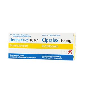 Показания к применениюДепрессивные эпизоды любой степени тяжести. Панические расстройства с и без агорафобии.Применение при беременности и кормлении грудьюПротивопоказано применение при беременности и в период лактации (грудного вскармливания).ПротивопоказанияГиперчувствительность, одновременный прием ингибиторов МАО, возраст до 15 лет, беременность, период лактации. C осторожностью. Почечная недостаточность (КК ниже 30 мл/мин), гипомания, мания, фармакологически неконтролируемая эпилепсия, депрессия с суицидальными попытками, сахарный диабет, пожилой возраст, цирроз печени, склонность к кровотечениям; одновременный прием с ЛС, снижающими порог судорожной готовности, вызывающими гипонатриемию, этанолом, ЛС, метаболизирующимися с участием системы CYP2C19.Побочное действиеСо стороны пищеварительной системы: наиболее часто — тошнота, снижение аппетита, диарея, запоры; редко — нарушения вкусовых ощущений; возможны — рвота, сухость во рту, изменение лабораторных показателей функции печени. Со стороны ЦНС и периферической нервной системы: наиболее часто — бессонница или сонливость, головокружение, слабость; возможны — расстройства зрения, судорожные припадки, тремор, двигательные нарушения, серотониновый синдром, галлюцинации, мания, спутанность сознания, ажитация, тревога, деперсонализация, панические атаки, повышенная раздражительность. Со стороны обмена веществ: наиболее часто — повышенная потливость, гипертермия; возможно — гипонатриемия. Со стороны половой системы: наиболее часто — снижение либидо, импотенция, нарушение эякуляции, аноргазмия (у женщин). Со стороны сердечно-сосудистой системы: возможна ортостатическая гипотензия. Со стороны эндокринной системы: возможно — недостаточная секреция АДГ, галакторея. Аллергические реакции: возможно — анафилактические реакции, ангионевротический отек. Дерматологические реакции: возможно — кожная сыпь, зуд, экхимозы, пурпура. Прочие: наиболее часто — синуситы; возможно — артралгия, миалгия, задержка мочи. При резкой отмене препарата после длительного применения возможны реакции отмены — головокружение, головные боли и тошнота. Выраженность данных реакций незначительна, а продолжительность ограничена. Побочные эффекты наиболее часто развиваются на 1 или 2 неделе лечения и затем обычно становятся менее интенсивными и возникают реже при продолжении терапии.СоставДействующее вещество: ЭсциталопрамКонцентрация действующего вещества (мг): 10 мг