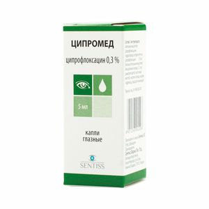 Показания к применениюБактериальные воспалительные заболевания глаза и его придатков:острый и подострый конъюнктивит;кератит;передний увеит;блефарит и другие воспалительные заболевания век;дакриоцистит;профилактика и лечение инфекционных осложнений после ранений глаза и его придатков и при операциях на глазном яблоке.Применение при беременности и кормлении грудьюЦипромед противопоказан к применению при беременности. При необходимости применения препарата в период лактации грудное вскармливание необходимо прекратить.ПротивопоказанияПовышенная чувствительность к компонентам препарата или к другим хинолонам, беременность, период грудного вскармливания и детский возраст до 1 годаПобочное действиеНепосредственно после инсталляции может отмечаться ощущение легкого жжения в течение 1-2 минут, зуд, болезненность, гиперемия слизистой оболочки глаза. Возможно развитие аллергических реакций. Отек век, светобоязнь, слезотечение, ощущение инородного тела в глазах, неприятный привкус во рту сразу после закапывания, снижение остроты зрения, появление белого кристаллического преципитата у больных с язвой роговицы, кератит, кератопатия, появление пятен или инфильтрация роговицы, развитие суперинфекции.Состав1 мл капель содержит:Активное вещество: ципрофлоксацин (в форме гидрохлорида) 3 мг.Вспомогательные вещества: бензалкония хлорид, натрия эдетат, молочная кислота, натрия хлорид, натрия гидроксид, вода д/и.Взаимодействие с другими препаратамиФармацевтическое взаимодействиеРаствор ципрофлоксацина несовместим с лекарственными препаратами со значением рН 3-4, которые физически или химически нестабильны.