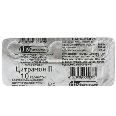 Фармакологическое действие Комбинированное лекарственное средство. Ацетилсалициловая кислота обладает жаропонижающим и противовоспалительным действием, ослабляет боль, особенно вызванную воспалительным процессом, а также умеренно угнетает агрегацию тромбоцитов и тромбообразование, улучшает микроциркуляцию в очаге воспаления. Кофеин повышает рефлекторную возбудимость спинного мозга, возбуждает дыхательный и сосудодвигательный центры, расширяет кровеносные сосуды скелетных мышц, головного мозга, сердца, почек, снижает агрегацию тромбоцитов; уменьшает сонливость, чувство усталости, повышает умственную и физическую работоспособность. В данной комбинации кофеин в малой дозе практически не оказывает стимулирующего действия на ЦНС, однако способствует нормализации тонуса сосудов мозга и ускорению кровотока. Парацетамол обладает анальгетическим, жаропонижающим и крайне слабым противовоспалительным действием, что связано с его влиянием на центр терморегуляции в гипоталамусе и слабовыраженной способностью ингибировать синтез простагландинов в периферических тканях. Лекарственное взаимодействие Усиливает действие гепарина, непрямых антикоагулянтов, резерпина, стероидных гормонов и гипогликемических лекарственных средств. Одновременное назначение с другими НПВС, метотрексатом увеличивает риск развития побочных эффектов. Уменьшает эффективность спиронолактона, фуросемида, гипотензивных лекарственных средств, а также противоподагрических лекарственных средств, способствующих выведению мочевой кислоты. Барбитураты, рифампицин, салициламид, противоэпилептические лекарственные средства и другие стимуляторы микросомального окисления способствуют образованию токсичных метаболитов парацетамола, влияющих на функцию печени. Метоклопрамид ускоряет всасывание парацетамола. Под воздействием парацетамола T1/2хлорамфеникола увеличивается в 5 раз. При повторном приеме парацетамол может усилить действие антикоагулянтов (производных дикумарина). Одновременный прием парацетамола и этанола повышает риск развития гепатотоксических эффектов. Кофеин ускоряет всасывание эрготамина.