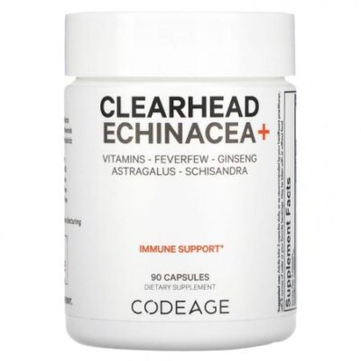 Производство, имеющее сертификат соответствия стандартам текущей надлежащей производственной практики (cGMP)Другое самочувствиеCodeage Clearhead Echinacea + предлагает усовершенствованную и комплексную формулу добавки с эхинацеей, в состав которой входят лимонник, пиретрум, коптис, американский женьшень, астрагал, листья оливы, орегано, чеснок, полифенолы, витамины C и D3, цинк, селен и пробиотики. поддерживают иммунную систему и кишечник.