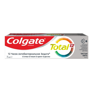 Для обеспечения здоровья всей полости рта необходима комплексная защита, а не только забота о зубах.Поэтому новый Colgate Total 12 Чистая Мята проактивно борется с бактериями не только на зубах, но и на языке, щеках и деснах в течение 12 часов*, обеспечивая здоровье всей полости рта.Почувствуйте разницу с уверенной, яркой и здоровой улыбкой!*При ежедневном использовании в течение 4 недельПРЕИМУЩЕСТВАНовый Colgate Total 12 Чистая Мята содержит передовую формулу, которая проактивно защищает всю полость ртаОна борется с бактериями не только на зубах, но и на языке, щеках и деснах в течение 12 часов*Новая формула обладает большим, чем когда-либо количеством преимуществ. Это значит, что это лучшая зубная паста для здоровья всей полости рта в линейке Colgate**.Обеспечивает превосходную защиту от налета, признаков воспаления десен, потемнений на эмали, зубного камня и кариеса, а также обеспечивает дополнительные преимущества — борьбу с бактериями для защиты эмали, мгновенную нейтрализацию неприятного запаха изо рта и более длительное ощущение свежести.*При ежедневном использовании в течение 4 недель** Новый Colgate Total обладает большим, чем когда-либо количеством преимуществ.Специальные особенности: Массовая доля фторида 0.145% (1450ppm F-)Результат:Защищает всю полость ртаОбеспечивает превосходную защиту от налета, признаков воспаления десен при борьбе с бактериямиНейтрализует неприятный запах изо ртаЗащищает от разрушения эмали, повышенной чувствительности зубов, кариеса, налета, зубного камня, потемнений на эмали и проблем с деснамиОбеспечивает более длительное ощущение свежести