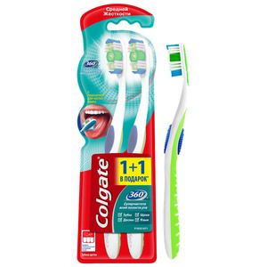 Зубная щетка Colgate 360 Суперчистота, средней жесткости 1+1шт. Удаляет на 96% больше бактерий. Подушечка для чистки языка и внутренней поверхности щек. Пучки щетины конической формы для чистки межзубных промежутков. Удлиненная щетина на кончике щетки. Полирующие чашечки бережно удаляют потемнения на э. Срок годности не ограничен.
