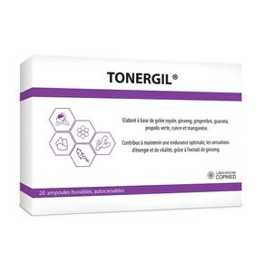 На протяжении более 30 лет лаборатории COPMED стремятся предложить вам лучшие преимущества природы для вашего здоровья благодаря полному спектру инновационных высококачественных французских натуральных продуктов. Некоторые решения стали эталонами на рынке и остаются непревзойденными по сей день.КОПМЕД ТОНЕРГИЛ / COPMED TONERGIL, 20 ампулПищевая добавка на основе маточного молочка, зеленого прополиса, растений и минералов.Помогает поддерживать оптимальную выносливость, энергичность и тонус благодаря экстракту женьшеня.Усталость, истощение, перегрузка… Вам нужен заряд энергии для повседневной жизни?Тонергил – синергичная комбинация активных веществ, специально отобранных за способность бороться с физической и умственной усталостью, дающая быстрый заряд энергии, жизненной силы и динамизма.Экстракт женьшеня помогает бороться с усталостью организма, помогает поддерживать оптимальную выносливость, энергичность и тонус.Экстракт гуараны помогает поддерживать физическую жизненную силу.Помогает снизить умственную усталость и повышает концентрацию.Экстракт имбиря обладает стимулирующими и тонизирующими свойствами, которые повышают сопротивляемость усталости. Повышает жизненный тонус и энергичность.Маточное молочко – беловатое желеобразное вещество, секретируемое железами молодых пчел-кормилиц. Предназначено для питания личинок на первой стадии их развития и остается единственным питанием маток на протяжении всей их жизни, а они являются известными долгожителями. Также называемый «королевское желе», этот ценный нектар состоит примерно на 50-65% из воды, сахаров, белков, жиров и многих других нутриентов.Зеленый прополис – уникальный комплекс, вырабатываемый пчелами из смолистых веществ, которые они специально собирают на эндемичном кустарнике – Baccharis Dracunculifolia (также называется полевой розмарин). Его характерный зеленый цвет является следствием его особого состава.Медь нормализует работу иммунной системы, защищает клетки от окислительного стресса и способствует нормальному энергетическому метаболизму.Марганец способствует нормальному энергетическому метаболизму и защищает клетки от окислительного стресса.