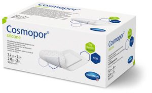Силиконовое покрытие Cosmopor®Для чувствительной и хрупкой кожиПовязка не прилипает к ране или хирургическим швамЭкссудат удерживается внутри прокладки, не попадая обратно в рануВодоотталкивающее средствоСамоклеящаяся, стерильная и полупроницаемая повязка для ран, состоящая из нетканого материала (основы) и раневой прокладки, покрытых перфорированным слоем силиконового клея и защищенных пленкой. Основными компонентами этих изделий являются:Подложка/основа: белый нетканый материал.Медицинский клей: силиконовый клей.Раневая повязка состоит из трёх слоёв: первый контактный слой для раны из полиэтиленовой сетки, второй слой для отвода экссудата из вискозы и третий впитывающий слой из нетканого материала с суперабсорбирующими волокнами.Плёнка: защитный пластиковый слой, соприкасающийся с клейкой стороной устройства.Абсорбирующая клейкая повязка с силиконовым контактным слоем