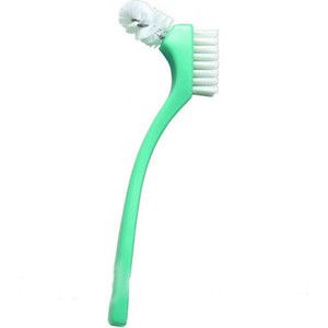Щетка Curadent для ухода за съемными зубными протезами, ортодонтическими аппаратами, спортивными и отбеливающими капами зеленая. Уникальная двусторонняя щетка ухаживает за внутренней и внешней поверхностью протеза. Эргономичная ручка, щетка с плотной щетиной, и спиралевидная щетка для труднодоступных зон протеза.