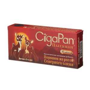 100 % натуральный состав: порошок из рогов Северного оленя. Содержит природный комплекс биологически активных компонентов: большой набор микро- и макроэлементов, витаминов, широкий спектр аминокислот, биологически активные пептиды, фосфолипиды. Форма выпускаТаблетки светло-серого до кремовато-серого с включением светло-коричневых, коричневых частиц с двояковыпуклой гравировкой «Ц» на одной стороне.Цыгапан® — это биологически активный комплекс с самым широким спектром доказанных лечебных свойств. Уникальные свойства препарата на основе субстанции из окостенелых рогов Северного оленя научно доказаны и неоспоримы! Многочисленные научные, доклинические и клинические исследования показали, что Цыгапан® оказывает общеукрепляющее действие для профилактики острых ихронических заболеваний, сокращения сроков их лечения, особенно часто и длительно болеющим детям.