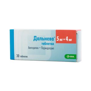 Показания к применению- артериальная гипертензия и/или ИБС: стабильная стенокардия напряжения у пациентов, которым требуется терапия периндоприлом и амлодипином.ПротивопоказанияПериндоприл- ангионевротический отек (отек Квинке) в анамнезе (в т.ч. на фоне приема других ингибиторов АПФ);- наследственный/идиопатический ангионевротический отек;- возраст до 18 лет (эффективность и безопасность не установлены);- повышенная чувствительность к периндоприлу или другим ингибиторам АПФ.Амлодипин- выраженная артериальная гипотензия (систолическое АД менее 90 мм рт.ст.);- шок, включая кардиогенный шок;- обструкция выходного тракта левого желудочка (например, выраженный стеноз аорты);- нестабильная стенокардия (за исключением стенокардии Принцметала);- возраст до 18 лет (эффективность и безопасность не установлены);- гемодинамически нестабильная сердечная недостаточность после острого инфаркта миокарда;- повышенная чувствительность к амлодипину или другим производным дигидропиридина.Дальнева- почечная недостаточность (КК менее 60 мл/мин);- возраст до 18 лет (эффективность и безопасность не установлены);- повышенная чувствительность к компонентам препарата.С осторожностью: печеночная недостаточность; хроническая сердечная недостаточность; аортальный и/или митральный стеноз; гипертрофическая обструктивная кардиомиопатия; двусторонний стеноз почечных артерий, стеноз артерии единственной функционирующей почки; почечная недостаточность (КК меньше60 мл/мин); системные заболевания соединительной ткани (в т.ч. системная красная волчанка, склеродермия); терапия иммунодепрессантами, аллопуринолом, прокаинамидом (риск развития нейтропении, агранулоцитоза); сниженный ОЦК (прием диуретиков, диета с ограничением поваренной соли, рвота, диарея); атеросклероз; цереброваскулярные заболевания; реноваскулярная гипертензия; сахарный диабет; применение дантролена, эстрамустина, калийсберегающих диуретиков, препаратов калия, калийсодержащих заменителей пищевой соли и препаратов лития; гиперкалиемия; хирургическое вмешательство/общая анестезия; проведение гемодиализа с использованием высокопроточных полиакрилнитриловых мембран (риск развития анафилактоидных реакций); проведение афереза ЛПНП с помощью декстран сульфата; одновременное проведение десенсибилизирующей терапии аллергенами (например, ядом перепончатокрылых); состояние после трансплантации почки (отсутствие клинических данных); пожилой возраст; применение у пациентов негроидной расы.СоставАмлодипина безилат 6.935 мг, что соответствует содержанию амлодипина 5 мгпериндоприла эрбумин а полуфабрикат-гранулы 21 мг, что соответствует содержанию периндоприла эрбумина 4 мгвспомогательные вещества: целлюлоза микрокристаллическая — 80.075 мг, крахмал прежелатинизированный — 21 мг, натрия крахмала гликолят — 8.4 мг, натрия гидрокарбонат — 760 мкг, кремния диоксид коллоидный, безводный — 430 мкг, магния стеарат — 1.4 мг.