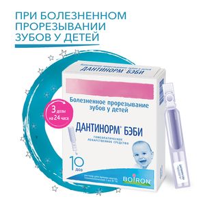 Дантинорм Бэби — гомеопатическое лекарственное средство, облегчающее основные симптомы при прорезывании зубов у малышей, а именно: боль и воспаление десен, раздражительность и плаксивость, беспокойный сон.Не имеет побочных эффектов и ограничений по возрасту.Раствор для применения внутрь в индивидуальной стерильной упаковке для однократного приема обеспечивает удобство и гигиеничность использованияГигиеничноНатуральное комплексное средство Ромашка аптечная(Сhamomilla vulgaris)Chamomilla vulgaris – C9При появлении раздражительности Индейский плющ(Phytolacca decandra)Phytolacca decandra C5При болях и воспалении десен Ревень лекарственный(Rheum officinale)Rheum officinale- C5При нарушении пищеваренияНадежноУникальная безопасная формула *, используемая у самых маленьких пациентов более 10 лет**, не содержит спирта, лактозы, сахара и красителей* 3 гомеопатических компонента, безопасных для детей** ни одного обращения по вопросам фармаконадзора за 10 летУдобноУникальная форма выпуска — дозированный раствор в индивидуальной стерильной упаковке