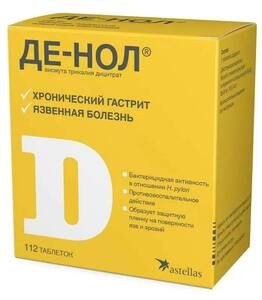 Показания к применениюЯзвенная болезнь желудка и двенадцатиперстной кишки в фазе обострения, в том числе ассоциированная с Helicobacter pylori. Хронический гастрит и гастродуоденит в фазе обострения, в том числе ассоциированный с Helicobacter pylori. Синдром раздражённого кишечника, протекающий преимущественно с симптомами диареи. Функциональная диспепсия, не связанная с органическими заболеваниями желудочно-кишечного тракта.Применение при беременности и кормлении грудьюДе-Нол противопоказан к применению при беременности и в период лактации.ПротивопоказанияВыраженное нарушение функции почек, беременность, лактация, индивидуальная непереносимость препарата.Побочное действиеСо стороны пищеварительной системы: возможно появление тошноты, рвоты, более частого стула, запоров. Эти явления не опасны для здоровья и носят временный характер. Аллергические реакции: кожная сыпь, зуд кожи. При длительном применении в высоких дозах – энцефалопатия, связанная с накоплением висмута в ЦНС.СоставКаждая таблетка содержит: Активное вещество: Висмута трикалия дицитрат – 304,6 мг, в пересчёте на оксид висмута В120з — 120 мг. Вспомогательные вещества: крахмал кукурузный, повидон КЗО, полиакриллат калия, макрогол 6000 , магния стеарат. Оболочка: Опадрай OY-S-7366, состоит из: гипромеллозы и макрогола 6000,Взаимодействие с другими препаратамиВ течение получаса до и после приёма Де-Нола не рекомендуется применение внутрь других лекарственных средств, а также приём пищи и жидкости, в частности, антацидов, молока, фруктов и фруктовых соков. Это связано с тем, что они при , одновременном приёме внутрь могут оказывать влияние на эффективность Де-Нола.