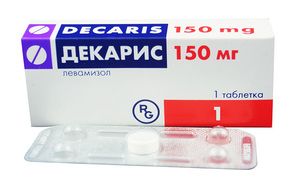 Показания к применениюЗаражения гельминтами Ascaris lumbricoides, Necator Americanus и Ancylostoma duodenale.Применение при беременности и кормлении грудьюБеременность. Беременным препарат назначать только в том случае, если ожидаемая польза превосходит возможный риск применения препарата. Период лактации. Для защиты новорожденного надо решить, прекратить ли кормление грудью или прекратить прием препарата, в зависимости от того, насколько необходимо принимать препарат для матери. Принимать с осторожностью при печеночной и/или почечной недостаточности, угнетении костномозгового кроветворения.ПротивопоказанияПовышенная чувствительность к одному из компонентов препарата. агранулоцитоз, вызванный лекарственными средствами (в анамнезе). детский возраст до 3 лет. период лактации. Для таблеток 150 мг детский возраст является Противопоказаниям! Беременность Беременным препарат назначать только в том случае, если ожидаемая польза превосходит возможный риск применения препарата. Период лактации Для защиты новорожденного надо решить, прекратить ли кормление грудью или прекратить прием препарата, в зависимости от того, насколько необходимо принимать препарат для матери. Принимать с осторожностью при печеночной или почечной недостаточности, угнетении костномозгового кроветворения.Побочное действиеГоловная боль, бессонница, головокружение, ощущение сердцебиения, судороги, диспепсические явления, такие как тошнота, рвота, боли в животе, диарея. Имеются сообщения о развитии явлений со стороны ЦНС (энцефалопатии) через 2-5 недель после приема препарата, а также аллергические реакции (кожная сыпь), судороги. У большинства пациентов это явление было обратимым, и раннее применение глюкокортикостероидной терапии улучшала прогноз. Связь этих симптомов с приемом Декариса не вполне убедительна. При применении больших доз или при длительной терапии может наблюдаться лейкопения, агранулоцитоз, треморСоставДействующее вещество: Левамизол. Концентрация действующего вещества (мг): 150 мгВзаимодействие с другими препаратамиПри одновременном приеме препарата со спиртными напитками наблюдаются дисульфирамоподобные явления. Требуется осторожность при применении Декариса с препаратами, влияющими на кроветворение. При одновременном приеме препарата с кумариноподобными антикоагулянтами протромбиновое время может удлиниться, поэтому необходимо скорректировать дозу перорального антикоагулянта. Декарис увеличивает уровень фенитоина в крови, поэтому при одновременном их применении необходимо контролировать уровень фенитоина в крови. Декарис нельзя одновременно применять с липофильными препаратами, такими как тетрахлорметан, тетрахлорэтилен, масло хеноподия, хлороформ или эфир, так как его токсичность может усилиться.