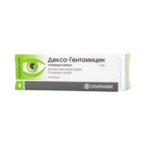 Показания к применениюИнфекции переднего отрезка глаза, вызванные чувствительной к гентамицину микрофлорой (конъюнктивит, кератит, блефарит, ячмень);Аллергические процессы переднего отрезка глаза, сопровождающиеся бактериальным инфицированием;Профилактика и лечение воспалительных явлений в послеоперационном периоде (после удаления катаракты и проведения антиглаукомных операций)Применение при беременности и кормлении грудьюАдекватных и строго контролируемых клинических исследований безопасности применения препарата Декса-Гентамицин при беременности и в период лактации не проводилось. Во II и III триместрах беременности и в период грудного вскармливания препарат можно применять в том случае, когда предполагаемая польза терапии для матери превышает потенциальный риск для плода или ребенка. Противопоказан в I триместре беременности.ПротивопоказанияКератит, вызванный вирусами Herpes simplex и Varicella zoster (древовидный кератит);Вирусные заболевания роговицы и конъюнктивы (в т.ч. при ветряной оспе);Грибковые заболевания глаз;Микобактериальные инфекции глаз;Острые гнойные заболевания глаз с поражением эпителия роговицы;Эпителиопатия роговицы;Ттравмы и язвенные поражения роговицы;Повышенное внутриглазное давление;I триместр беременности;Детский и подростковый возраст до 18 лет (в связи с отсутствием данных по эффективности и безопасности);Ношение контактных линз;Повышенная чувствительность к компонентам препарата.Во время применения препарата не рекомендуется пользоваться контактными линзами.Побочное действиеРедко: аллергические реакции, ощущение жжения в глазу после применения препарата.Возможно: контактный дерматит, герпетический кератит, перфорация роговицы при наличии кератита, грибковая инфекция, усиление выраженности бактериальной инфекции роговицы, птоза, мидриаза. Применение после травм роговицы может приводить к замедлению ее заживления. При длительном применении — развитие вторичной глаукомы, стероидной катаракты.СоставНа 1 мл: дексаметазона натрия фосфат 1 мг, гентамицина сульфат 5 мг, что соответствует содержанию гентамицина 3 мг. Вспомогательные вещества: бензалкония хлорид (консервант) — 0.05 мг, калия гидрофосфат — 1.88 мг, калия дигидрофосфат — 5.86 мг, натрия хлорид — 5 мг, вода д/и — до 1 мл.Взаимодействие с другими препаратамиПри совместном применении с атропином, другими холинергическими препаратами, препаратами, вызывающими мидриаз возможно повышение внутриглазного давления.При местном применении гентамицин несовместим с амфотерицином В, гепарином, сульфадиазином, цефалотином и клоксациллином. Местное применение этих препаратов вместе с гентамицином может привести к отложению преципитатов в конъюнктивальной полости.