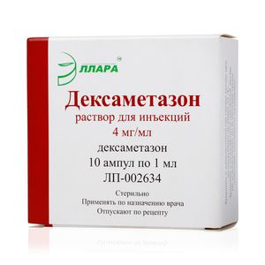 Показания к применениюДля приема внутрь: болезнь Аддисона-Бирмера острый и подострый тиреоидит, гипотиреоз, прогрессирующая офтальмопатия, связанная с тиреотоксикозом бронхиальная астма ревматоидный артрит в фазе обострения НЯК заболевания соединительной ткани аутоиммунные гемолитические анемии, тромбоцитопения, аплазия и гипоплазия кроветворения, агранулоцитоз, сывороточная болезнь острая эритродермия, пемфигус (обычный), острая экзема (в начале лечения) злокачественные опухоли (в качестве паллиативной терапии) врожденный адреногенитальный синдром отек головного мозга (обычно после предварительного парентерального применения ГКС). Для парентерального введения: шок различного генеза, отек головного мозга (при опухоли головного мозга, черепно-мозговой травме, нейрохирургическом вмешательстве, кровоизлиянии в мозг, энцефалите, менингите, лучевом поражении), астматический статус, тяжелые аллергические реакции (отек Квинке, бронхоспазм, дерматоз, острая анафилактическая реакция на лекарственные препараты, переливание сыворотки, пирогенные реакции), острые гемолитические анемии, тромбоцитопения, острая лимфобластная лейкемия, агранулоцитоз тяжелые инфекционные заболевания (в сочетании с антибиотиками), острая недостаточность коры надпочечников, острый круп заболевания суставов (плечелопаточный периартрит, эпикондилит, стилоидит, бурсит, тендовагинит, компрессионная невропатия, остеохондроз, артриты различной этиологии, остеоартроз). Для применения в офтальмологической практике: негнойный и аллергический конъюнктивит, кератит, кератоконъюнктивит без повреждения эпителия, ирит, иридоциклит, блефароконъюнктивит, блефарит, эписклерит, склерит, воспалительный процесс после травм глаза и оперативных вмешательств, симпатическая офтальмия. Применение при беременности и кормлении грудьюПри беременности (особенно в I триместре), а также в период лактации дексаметазон применяют с учетом ожидаемого лечебного эффекта и отрицательного влияния на плод. При длительной терапии при беременности не исключена возможность нарушений роста плода. В случае применения в конце беременности существует опасность возникновения атрофии коры надпочечников у плода, что может потребовать проведения заместительной терапии у новорожденного.Состав1 мл дексаметазона фосфат (в форме натриевой соли) 4 мг. Вспомогательные вещества: глицерол — 22.