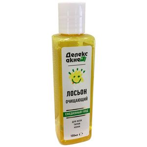 Лосьон очищающий Делекс-акне Универсальное средство для очищения и всех типов кожи лица и тела Удаляет излишек кожного сала Уменьшает склонность к образованию черных точек Создает оптимальный уровень pH и обеспечивает защитный барьер коже Подготавливает кожу к нанесению гелей Делекс Приятный запахЛосьон очищающий Делекс-акне применяется для ежедневного ухода за кожей лица и тела любого типа, в том числе нормальной и жирной, а также склонной к угревым высыпаниям. Лосьон используется после умывания с применением Геля для умывания Азуленового, перед нанесением косметических средств.Для кожи с признаками акне Лосьон очищающий применяется вместо обычного умывания (утро/вечер) и перед нанесением Гелей от угрей Делекс-акне.Лосьон очищающий Делекс-акне благодаря активно действующим компонентам и сбалансированному значению pH, эффективно удаляет загрязнения и излишек липидов с поверхности кожи, заметно уменьшает жирный блеск, смягчает и освежает кожу.Обеспечивает коже защитный барьер, препятствующий появлению воспалений.Все средства Делекс-акне прошли дерматологический контроль, не содержат спирт, гормоны и антибиотики и могут применяться как взрослыми, так и подростками.Активные компоненты:Лимонная кислота — выравнивает цвет кожи, легкое отбеливающее действиеКислота борная — успокаивает кожу и поддерживает рНКалендула — снимает воспаление кожи (покраснение), рассасывает уплотнение кожиМентол обладает успокаивающим действиемКрапива — снимает воспаление кожи (покраснение)