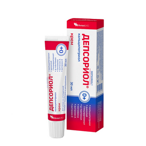 Депсориол — серия средств для людей, страдающих вульгарным псориазом, в том числе с поражением кожи головы.Крем косметический Депсориол создан на основе известного средства кальципотриол (аналог активного метаболита витамина D3), служащего для всех видов кожи с различными проблемами утолщения, сухости и шелушения на всех участках кожи (в т.ч. кожа головы, локти, ступни).При проблемах утолщения, сухости и шелушения коже необходим особый уход.В составе крема Депсориол содержится комплекс активных компонентов, которые обеспечивают такой уходКальципотриол — активный метаболит витамина Д3, регулирует иммунные процессы в коже.Дикалий глицирризинат является активным компонентом, полученным из лекарственного растения солодка. Он обладает выраженной противовоспалительной активностью и делает кожу менее восприимчивой к веществам, вызывающим аллергию, раздражение и зуд.Д-пантенол — оказывает регенерирующее действие, предупреждает появление микротрещин, увлажняет кожу. Контролирует воспалительные реакции и повышает защитные свойства кожи к воздействию раздражителей.Мочевина — компонент натурального увлажняющего фактора кожи, оказывает быстрый и длительно сохраняющийся увлажняющий эффект.Витамин Е — антиоксидант, замедляющий процессы старения, обладает увлажняющими свойствами, поддерживая водно-липидный баланс. Способствует быстрой регенерации клеток кожи. Помогает защитить кожу от вредного воздействия ультрафиолета.Натуральные масла (ши, кокосовое, оливковое) полностью усваиваются кожей, успокаивают ее, питают и смягчают.Глицерин — активный увлажняющий ингредиент, снимает ощущение сухости.Витамин А необходим для нормального функционирования и здорового вида кожи.Депсориол крем не содержит гормонов, красителей и белков.