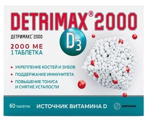 ДЕТРИМАКС® АКТИВ содержит витамин D3 (холекальциферол) — жизненно важный жирорастворимый витамин, необходимый для обеспечения деятельности практически всех органов и систем человеческого организмаВитамин D играет важную роль в обеспечении деятельности различных органов и систем:Костно-мышечная системаУчаствует в регуляции фосфорно-кальциевого обмена: помогает всасываться кальцию в кишечнике, поддерживает необходимые уровни кальция и фосфора в крови, активизирует костный метаболизм. Способствует обеспечению прочности костей и снижению риска потери костной массы и минеральной плотности кости1,2. Поддержание нормального уровня витамина D крайне необходимо в любом возрасте, но особенно в пожилом, когда повышается риск падений и переломов костей.Витамин D укрепляет зубы, активируя продукцию дентина, основной составляющей твердой ткани зубов. Достаточный уровень витамина D в организме поддерживает здоровье зубов3.Способствует поддержанию силы мышц и нервно-мышечной проводимости4. Недостаток витамина D ассоциирован с мышечной слабостью, вследствие чего особенно пожилые люди могут испытывать трудности при ходьбе.Иммунная системаСпособствует поддержанию здоровой иммунной функции, положительно влияя как на врожденный, так и на приобретенный иммунитет4. Запускает в клетках кожи, эпителия респираторного и желудочно-кишечного тракта синтез собственных антимикробных веществ: белков кателицидинов и дефензинов, уничтожающих вирусы, бактерии и грибы, благодаря чему доказанно способствует снижению риска развития простудных заболеваний11.Бронхолегочная системаВитамин D является необходимым фактором для поддержания нормальной функции легких14.Он участвует в поддержании функции мышц дыхательных путей, регуляции деятельности иммунных клеток и здоровом воспалительном ответе15. Витамин D способствует улучшению дыхательной функции легких и повышению защиты организма от широкого спектра вирусных и бактериальных инфекций14.Репродуктивная функцияВитамин D оказывает положительное влияние на репродуктивную функцию как у женщин, так и у мужчин5,6, в том числе у пар, планирующих беременность или испытывающих трудности при зачатии ребенка. У женщин с достаточным уровнем витамина D оплодотворение яйцеклеток происходит чаще. Отсутствие недостатка витамина D позволяет улучшить результаты ЭКО. Витамин D способен оказывать позитивное влияние на эндометрий, препятствуя пролиферативным процессам, улучшает овариальный фолликулогенез и способствует созреванию яйцеклетки.Эндокринная системаВитамин D участвует в регуляции функции практически всех эндокринных желез. Он стимулирует синтез женских и мужских половых гормонов: эстрогенов, прогестерона, тестостерона. Способствует поддержанию нормальной функции щитовидной и паращитовидных желез, коры надпочечников, а также бета-клеток поджелудочной железы, выделяющих инсулин.Углеводный и жировой обменВитамин D способствует улучшению углеводно-жирового обмена, позитивно влияет на метаболизм глюкозы и инсулина, а недостаток витамина D является фактором риска для развития инсулинорезистентности, нарушения толерантности к глюкозе.Витамин D может стимулировать секрецию инсулина бета-клетками поджелудочной железы, а также опосредованно активирует кальций-зависимую эндопептидазу 