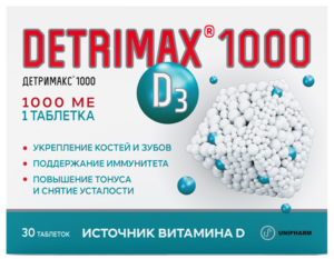 Показания к применениюВ качестве БАДа к пище — дополнительного источника витамина DПрименение при беременности и кормлении грудьюПродукт не имеет противопоказаний в период беременности, но принимать его следует с осторожностью. Перед применением рекомендуется проконсультироваться с врачом.ПротивопоказанияИндивидуальная непереносимость компонентов продукта.Составактивное вещество:холекальциферол (витамин D3)25 мкг (1000 МЕ)вспомогательные вещества: орто-Фосфат кальция 2-замещенный (носитель); микрокристаллическая целлюлоза Е460 (антислеживающий агент)оболочка таблетки: гидроксипропилметилцеллюлоза Е464 (носитель); титана диоксид Е171 (краситель), полидекстроза Е1200 (стабилизатор); тальк Е553 (антислеживающий агент); мальтодекстрин; среднецепочечные триглицериды; магниевая соль стеариновой кислоты Е572 (стабилизатор)