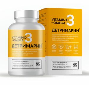 ДЕТРИМАРИН — Биологически активная добавка (БАД) к пищеВнешний вид и свойства: овальные прозрачные желатиновые капсулы светло-желтого цвета.В одной капсуле Детримарина содержится: 2000 МЕ витамина D3 и 450 мг омега-3 кислот, из которых 395 мг находятся в виде высокоочищенных форм эйкозапентаеновой (ЭПК) и докозагексаеновой (ДГК) кислот.Витамин D — жизненно важный жирорастворимый витамин, необходимый для нормальной работы практически всех органов и систем человеческого организма. Эйкозапентаеновая (ЭПК) и докозагексаеновая (ДГК) кислоты, относящиеся к незаменимым омега-3 полиненасыщенным жирным кислотам, являются ключевыми структурными компонентами мембран клеток, поэтому их регулярное поступление необходимо для эффективной работы большинства органов систем нашего организма.