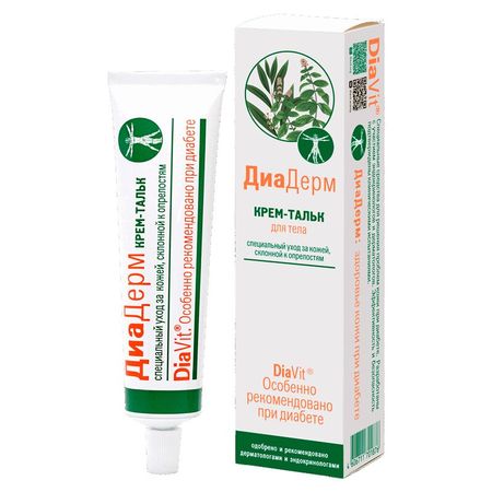 Специально разработан для ухода за кожей для людей с диабетом, предназначен для ухода за кожей, склонной к опрелостям: на коже внутренних поверхностях бедер, под молочными железами, в складках кожи и при натирании плотно прилегающими частями одежды: • подсушивает опрелости за счет талька и оксида цинка; • предупреждает покраснение и раздражение в складках благодаря аллантоину, маслу чайного дерева и маслу лимона; • облегчает болезненные ощущения при трении кожи и обеспечивает легкий охлаждающий эффект благодаря маслу мяты и ментолу. Благодаря кремовой текстуре Крем-тальк Диадерм не скатывается в валик (как сухой тальк), не травмирует дополнительно кожу, а легко и равномерно распределяется по коже, превращаясь в тонкий, шелковистый слой талька. Рекомендован врачами-эндокринологами и дерматологами для ежедневного ухода за сухой кожей ног при диабете. Не является лекарством. Проведена Добровольная клиническая апробация на базе Центра Диабета, г. Самара и на Кафедре дерматовенерологии и клинической микологии с курсом лабораторной диагностики и лабораторной микологии РМАПО, г. Москва.