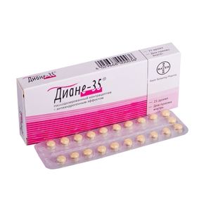 Показания к применениюКонтрацепция у женщин с явлениями андрогенизации. Лечение андрогензависимых заболеваний у женщин, таких как акне, особенно распространенных форм и форм, сопровождающихся себореей, воспалением или образованием узелков (папулезно-пустулезные угри, узелково-кистозные угри); андрогенетическая алопеция и легкие формы гирсутизма.Применение при беременности и кормлении грудьюДиане-35 противопоказан к применению при беременности и в период лактации.ПротивопоказанияТромбоз и тромбоэмболия , цереброваскулярные нарушения, выявленная приобретенная или наследственная предрасположенность к венозному или артериальному тромбозу, включая резистентность к активированному протеину С, дефицит антитромбина III, дефицит протеина С, дефицит протеина S, гипергомоцистеинемия, наличие высокого риска венозного или артериального тромбоза , мигрень с очаговыми неврологическими симптомами, панкреатит с выраженной гипертриглицеридемией, сахарный диабет с сосудистыми осложнениями, печеночная недостаточность и тяжелые заболевания печени, тяжелая и/или острая почечная недостаточность, опухоли печени (доброкачественные или злокачественные), выявленные гормонозависимые злокачественные новообразования (в том числе половых органов или молочных желез) или подозрение на них, кровотечение из влагалища неясного генеза, беременность или подозрение на нее, период грудного вскармливания, повышенная чувствительность или непереносимость любого из компонентов препарата, наследственная непереносимость лактозы.Побочное действиеПерепады настроения, депрессия/подавленное настроение, мигрень, тошнота, бол в молочных залозах, маточные кровотечения, уменьшение или потеря либидо.СоставДействующее вещество: Ципротерон(Cyproterone) + Этинилэстрадиол(Ethinylestradiol)Концентрация действующего вещества (мг): Ципротерона ацетата — 2 мг, этинилэстрадиол — 0,035 мгВзаимодействие с другими препаратамиПри одновременном применении Диане-35 с индукторами микросомальных печеночных ферментов (гидантоинами, барбитуратами, примидоном, карбамазепином и рифампицином; а также, возможно, с окскарбазепином, топираматом, фелбаматом и гризеофульвином) повышается клиренс этинилэстрадиола и ципротерона, что может привести к прорывным маточным кровотечениям или снижению надежности контрацепции.При одновременном применении с ампициллинами и тетрациклинами контрацептивная надежность Диане-35 снижается.