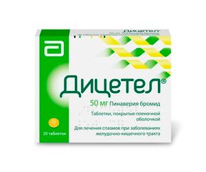 Показания к применениюСимптоматическое лечение болей, нарушений транзита кишечного содержимого и дискомфорта, связанных с функциональными расстройствами работы кишечника; — Симптоматическое лечение болей, связанных с функциональными расстройствами желчевыводящих путей; — Подготовка к рентгенологическому исследованию желудочно-кишечного тракта с применением бария сульфата.ПротивопоказанияПовышенная чувствительность к любому из компонентов препарата.- Дефицит лактазы, непереносимость галактозы, глюкозо-галактозная мальабсорбция.В связи с недостаточностью данных по эффективности и безопасности применение препарата у детей до 18 лет не рекомендовано.Применение при беременности и в период грудного вскармливанияНет достаточных данных применения пинаверия бромида беременными женщинами.Исследования на животных недостаточно информативны для оценки воздействия препарата на беременность, развитие эмбриона/плода, протекание родов или постнатальное развитие ребенка. Потенциальный риск для человека неизвестен. Применение препарата во время беременности допускается, если польза от применения для матери превышает потенциальный риск для плода.Кроме того, следует принять во внимание, что в состав препарата входит бром. В связи с этим назначение пинаверия бромида в конце беременности может вызвать неврологические расстройства (снижение артериального давления, седацию) у новорожденного.Нет достаточной информации об экскреции препарата Дицетел® с материнским молоком у животных и человека. Физико-химические и доступные данные по фармакодинамике и токсикологии препарата Дицетел® указывают на экскрецию препарата с молоком матери, в связи с чем риск для грудного ребенка не может быть исключен.Препарат Дицетел® не следует применять в период грудного вскармливания.Состав1 таблетка, покрытая пленочной оболочкой, содержит:Действующее вещество: пинаверия бромид — 50,0 мгВспомогательные вещества: кремния диоксид коллоидный — 1,00 мг , целлюлоза микрокристаллическая — 79,35 мг , тальк — 3,00 мг , магния стеарат — 1,50 мг , крахмал прежелатинизированный — 17,00 мг , лактозы моногидрат — 18,15 мг (.Пленочное покрытие: стеариновая кислота — 0,767 мг , пленочное покрытие Orange 2 — 10,283 мг ) (бутилметакрилата сополимер — 51,1573 %, натрия лаурилсульфат — 5,1182 %, гипромеллоза — 2,1492 %, тальк — 40,5008 %, краситель железа оксид желтый — 1,0208 %, краситель железа оксид красный — 0,0537 %).