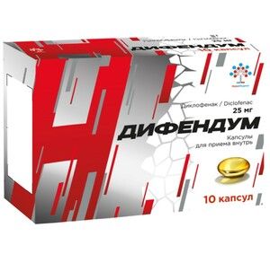 Дифендум, 25 мг, капсулы Овальные капсулы с желтой полупрозрачной оболочкой. Содержимое капсул: прозрачная жидкость от бесцветного до светло-желтого цвета.