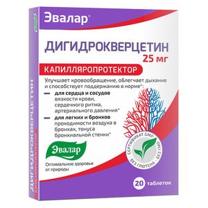 Дигидрокверцетин — это биофлавоноид лиственницы сибирской, который хорошо известен не только в России, но также в Америке и Европе. Это более фармакологически чистая форма кверцетина, которая не является токсичной даже при сверхвысоких дозах.В ходе многочисленных научных исследований было доказано, что дигидрокверцетин благотворно влияет на состояние сосудистой стенки капилляров, уменьшает вязкость крови и препятствует тромбообразованию. У людей с бронхо-легочными заболеваниями при пневмонии, хроническом бронхите, астме, ХОБЛ (хронической обструктивной болезни легких) он способствует уменьшению частоты приступов, более быстрому исчезновению кашля, одышки, отечности бронхов, улучшению проходимости бронхов, восстановлению легочной ткани и нормального дыхания.В американских протоколах Медицинской школы Восточной Вирджинии говорится о доказанной эффективности кверцетина лечении коронавируса. Также последние данные исследований из Китая показывают, что дигидрокверцетин весьма перспективен для лечения коронавируса.Биологически активная добавка «Дигидрокверцетин» создана, чтобы помочь вам сохранить в здоровом состоянии легкие, бронхи и сердце. Эффект достигается за счет положительного воздействия на сосуды этих органов и реологические характеристики крови.