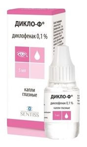 Показания к применению- ингибирование миоза во время операции по поводу катаракты;- лечение и профилактика воспалительных процессов после хирургических вмешательств на глазном яблоке;- профилактика кистозного отека макулы после операций по поводу катаракты;- лечение неинфекционных конъюнктивитов;- лечение и профилактика посттравматического воспалительного процесса при проникающих и непроникающих ранениях глазного яблока (в качестве дополнения к местной антибактериальной терапии).Применение при беременности и кормлении грудьюВ настоящее время нет данных по применению препарата Дикло-Ф при беременности и в период лактации.При применении НПВС в III триместре беременности возможно увеличение риска возникновения нарушений кровообращения плода.Применение препарата у беременных женщин и в период грудного вскармливания возможно только в случае, если ожидаемая польза терапии для матери превышает потенциальный риск для плода или грудного ребенка.Противопоказания- нарушение кроветворения неясного генеза;- эрозивно-язвенные процессы в ЖКТ в стадии обострения;- повышенная чувствительность к ацетилсалициловой кислоте или другим НПВС;- повышенная чувствительность к диклофенаку или вспомогательным компонентам препарата.Побочное действиеСо стороны органа зрения: редко — жжение, нечеткость зрительного восприятия (сразу после закапывания), помутнение роговицы, ирит.Аллергические реакции: зуд в глазах, гиперемия, ангионевротический отек лица, лихорадка, озноб, фотосенсибилизация, кожная сыпь (преимущественно эритематозная), крапивница, многоформная экссудативная эритема.Прочие: тошнота, рвота.СоставНа 1 мл: диклофенак натрия 1 мг. Вспомогательные вещества: бензалкония хлорид, динатрия эдетат, борная кислота, трометамин, полиоксил 35 касторовое масло, вода д/и.Взаимодействие с другими препаратамиПри одновременном применении препарата с дифлунизалом и другими НПВС (в т.ч. с ацетилсалициловой кислотой в высоких дозах 3 г/сут и более), препаратами сульфонилмочевины, метотрексатом возможно развитие кровотечения из ЖКТ.Применение одновременно с препаратами лития, дигитоксином, непрямыми антикоагулянтами приводит к усилению их эффекта.При необходимости возможно одновременное назначение других лекарственных средств в форме глазных капель (в т.ч. ГКС), но перерыв между инстилляциями должен быть не менее 5 мин для предотвращения вымывания действующих веществ.