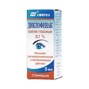 Показания к применениюИнгибирование миоза во время операции по поводу катаракты.Воспалительные процессы после хирургических вмешательств.Профилактика кистоидного отека зрительного нерва до и после операции, связанной с удалением и имплантацией хрусталика.Воспалительные процессы неинфекционной природы с вовлечением передних отделов глаза.Посттравматическое воспаление после проникающих и непроникающих ранений глазного яблока.Болевой синдром при проведении эксимерного лазерного вмешательства.Применение при беременности и кормлении грудьюПротивопоказано в III триместре беременности. В период лактации применять с осторожностьюПротивопоказанияПовышенная чувствительность к нестероидным противовоспалительным препаратам и другим компонентам препарата.III триместр беременности.Детский возраст (до 2-х лет).Побочное действиеЖжение глаз.Нечеткость зрительного восприятия (сразу после закапывания).Помутнение роговицы (бельмо).Ирит.Аллергические реакции:Зуд в глазах.Гиперемия конъюнктивы.Ангионевротический отек лица.Лихорадка.Озноб.Фотосенсибилизация.Кожная сыпь (преимущественно эритематозная).Крапивница.Тошнота и рвота .СоставНа 1 мл:Действующее веществоДиклофенака натрия — 1 мг.Вспомогательные веществаНатрия хлорид, пропиленгликоль, натрий фосфорнокислый однозамещенный 2-водный (натрия дигидрофосфат дигидрат), натрий фосфорнокислый двузамещенный 12-водный (динатрия гидрофосфат додекагидрат), динатриевая соль этилендиаминтетрауксусной кислоты (эдетат динатрия), 1 М раствор натра едкого (натрия гидроксид) до pH 6,5-7,5, вода для инъекций до 1 мл.Взаимодействие с другими препаратамиНе рекомендуется одновременное применение Диклофенака с дифлунизалом (возможно развитие кровотечения из ЖКТ) и другими НПВС (включая ацетилсалициловую кислоту в высоких дозах /≥3 г/сут/), препаратами сульфонилмочевины, метотрексатом.Одновременное применение Диклофенака с препаратами лития, дигитоксином, непрямыми антикоагулянтами приводит к усилению их эффекта.При необходимости Диклофенак можно применять одновременно с другими глазными каплями, в т.ч. содержащими ГКС. При этом перерыв между аппликациями должен быть не менее 5 мин для предотвращения вымывания действующих веществ последующими дозами.